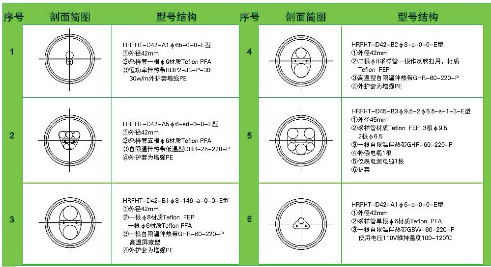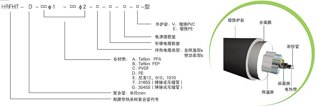耐腐采樣伴熱復合管是環(huán)保監(jiān)測系統(tǒng)中的重要部件,它是由一組耐腐高性能樹脂導管輔以自限溫伴熱帶以及補償線纜組成內(nèi)芯,外加保溫層,最后敷以阻燃聚乙烯(PE)保護外套復合而成。自限溫伴熱帶的自動限溫功能,可以保證采樣管內(nèi)維持一定的溫度,從而盡可能保證采集樣品與初始值保持一致,最終確保環(huán)保監(jiān)測系統(tǒng)連續(xù)、正確地采集樣氣。根據(jù)采集樣氣的成份、溫度等實際情況,耐腐伴熱采樣復合管中采樣導管可以選用不同的材質(zhì),如PFA(四氟乙烯與全氟烷基醚共聚物)、FEP(四氟乙烯和六氟丙烯共聚物)、PVDF(聚偏二氟乙烯)、PE(阻燃聚乙烯)、尼龍610等等, 伴熱帶可以選用中、低、高溫度伴熱帶,另外還可以根據(jù)用戶要求添加補償導線、電源線等 。