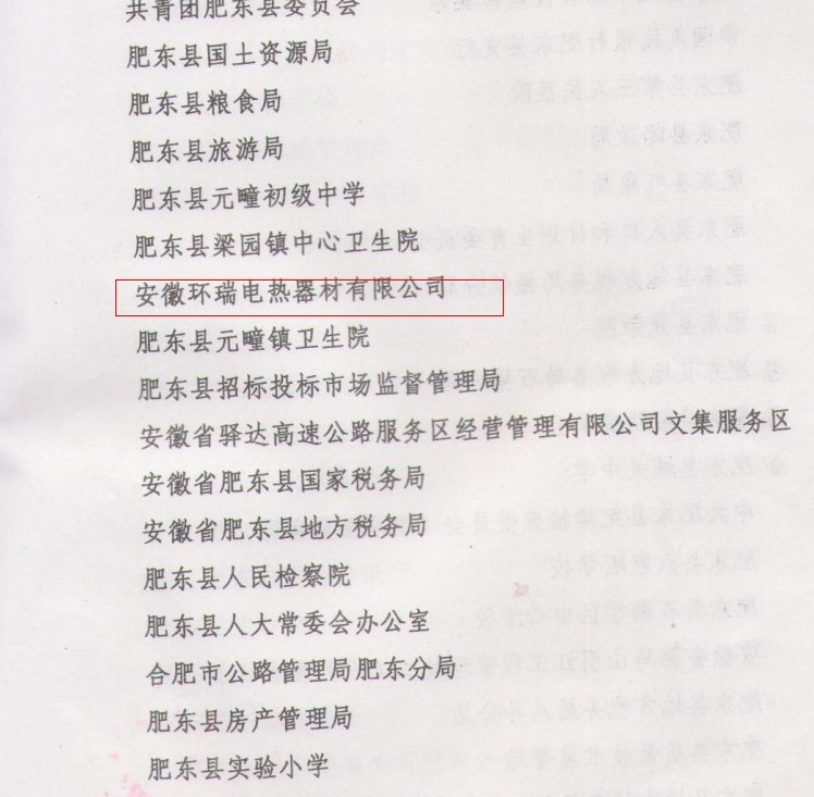 安徽環(huán)瑞電熱器材有限公司有幸成為其中的一員,我們將再接再厲,發(fā)揚成績,為推進社會主義物資文明,政治文明,精神文明和生態(tài)文明建設,構建和諧社會的偉大實踐中更好的發(fā)揮示范帶頭作用。做出新的更大的貢獻。提供思想保障,精神動力和智力支持。