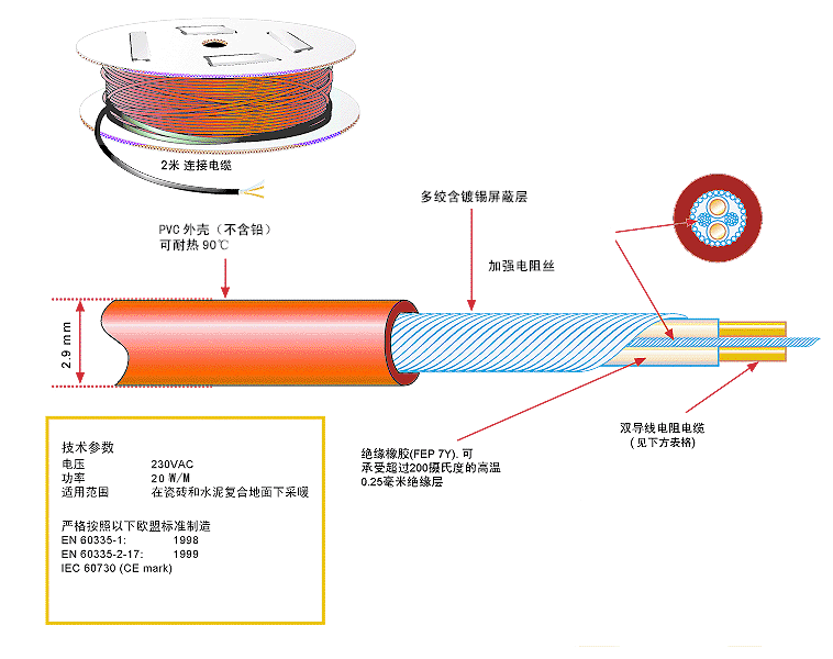 環瑞最新研發5.0±10%毫米直徑的雙導電地熱線-新型發熱電纜,可滿足5毫米-100毫米不同覆蓋厚度設計